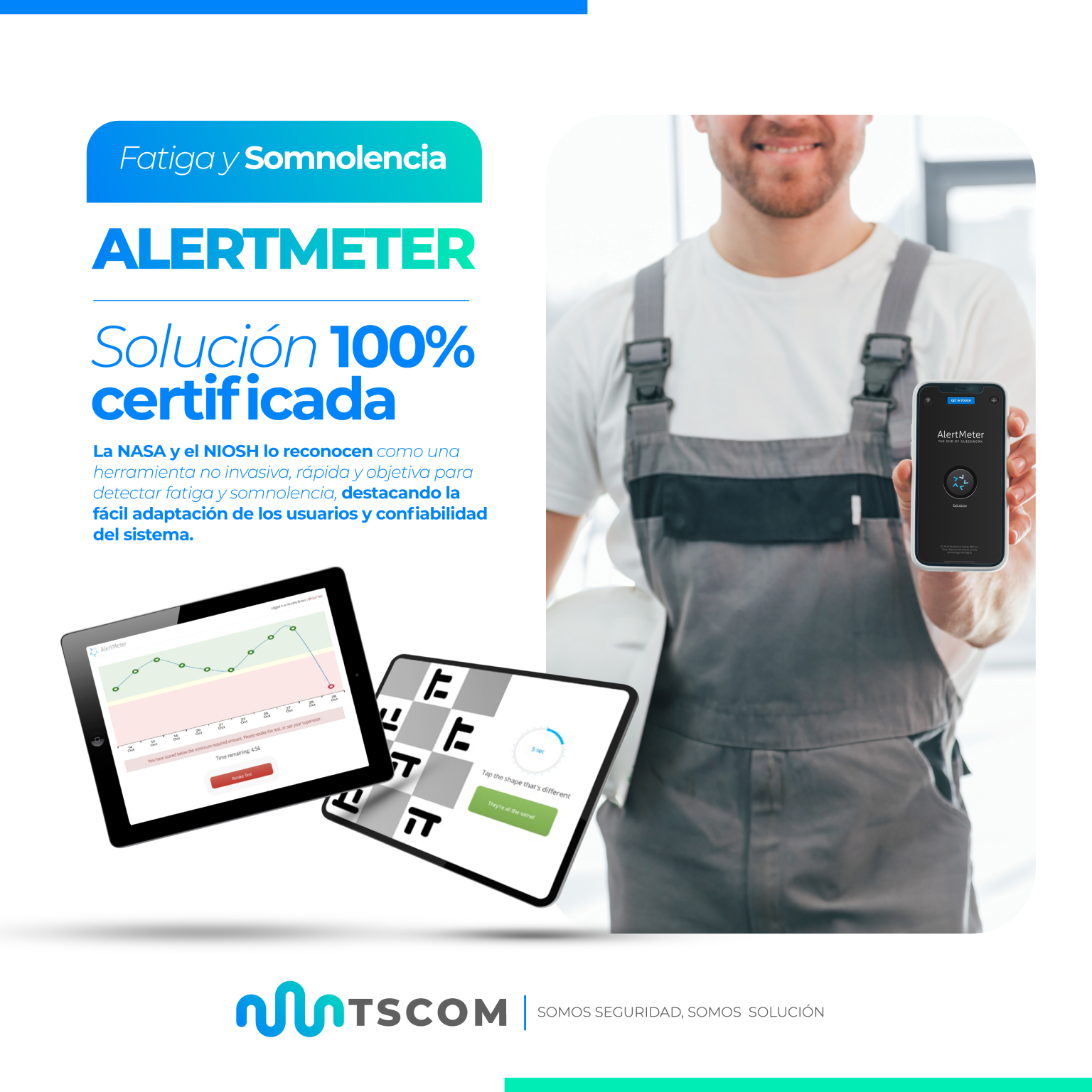 AlertMeter aumenta la seguridad y confianza en tu equipo al detectar de manera proactiva la fatiga y alteraciones en los niveles de alerta. Con un test de vigilancia psicomotora (PVT amigable para el usuario, cada operador construye su línea base y los resultados son comparados continuamente con ella. El test, presentado en formato de app, evalúa velocidad y precisión en la identificación de figuras, centralizando los resultados en una plataforma que facilita la toma de decisiones basadas en datos precisos.